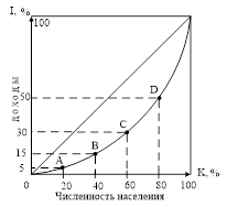 3) Кривая Лоренца: строится на основе кумулятивных данных о доходах групп населения, объединенных по величине дохода. На основании формы кривой Лоренца делается вывод о равномерности распределения дохода: если кривая Лоренца - биссектриса угла, то это свидетельствует о равномерном распределении дохода и чем дальше она отдалена от биссектрисы, тем неравномернее распределение дохода (рис.9.1).