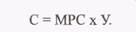 Угол наклона функции потребления — это предельная склон­ность к потреблению (МРС). Предельная склонность к потребле­нию - это доля прироста дохода (У), на величину которой увеличивается потребление (С).