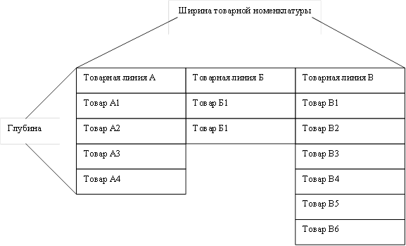 в) Степень разнообразия товаров разных ассортиментных групп.