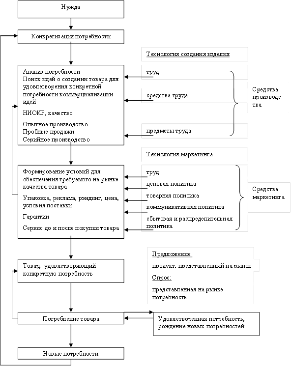 Благодаря деятельности маркетолога технология создания изделия как процесс превращения конкретной потребности в совокупности материализованных в той или иной вещи полезных технико-экономических характеристик интегрируется с технологией маркетинга, процессом создания характеристик окружения этой вещи, продукта, в результате чего создается товарное предложение, которое характеризует спрос, т.е. представленную на рынке потребность в этом продукте.