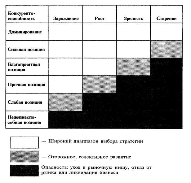 Стратегический план, характеризующий деятельность организаций, рабо­тающих в рыночных условиях, использует другую парадигму: «Завтрашний день необязательно будет лучше сегодняшнего». И если ситуационный анализ обна­ружил падение спроса на какую-то продукцию, даже при наличии необходи­мых ресурсов руководство данном предприятия не будет наращивать объемы ее выпуска, а скорее выберет стратегии уменьшения выпуска или переключения на выпуск другой продукции. Таким образом, простая экстраполяция на буду­щее из прошлого, исходя из изученных тенденций развития, использовавшаяся ранее в долгосрочном планировании, не годится. В основу разработки стратеги­ческого плана ложится анализ перспектив развития организации при опреде­ленных предположениях об изменении внешней среды, в которой она функци­онирует. Важнейшим элементом этом анализа является определение позиции организации в конкурентной борьбе за рынки сбыта своей продукции. На ос­нове такого анализа цели развития организации, формируются отдельные на­правления производственно-хозяйственной деятельности (отдельных бизнесов) и выбираются стратегии достижения целей.