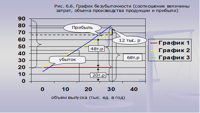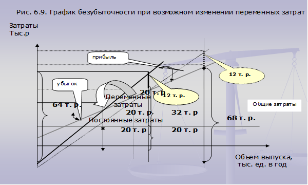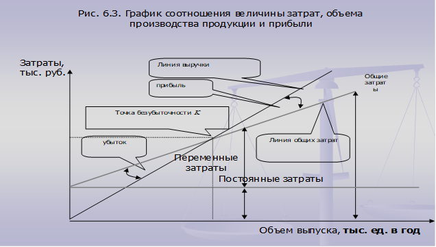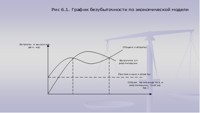 Как видно из рисунка 6.1, линия выручки от реализации пересекает линию общих затрат в двух точках. Это означает, что в экономической модели безубыточности существует два уровня выпуска и реализации продукции, при которых общие затраты равны выручке от реализации, т. е. две точки безубыточности. На поведение совокупных затрат в этой модели наиболее сильное влияние оказывают переменные издержки, изменяющиеся в соответствии с известным эффектом масштаба.