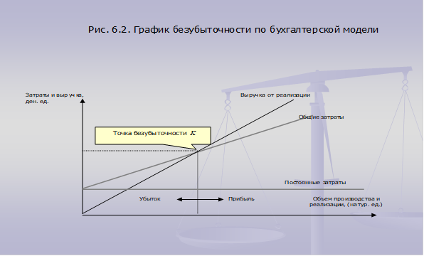 При построении бухгалтерской модели делается допущение о неизменности переменных затрат и цены реализации единицы продукции, в результате чего зависимость выручки от реализации и общих затрат от изменения объема производства и реализации имеет линейный характер. Диаграмма безубыточности по бухгалтерской модели отражена на рисунке 6.2.