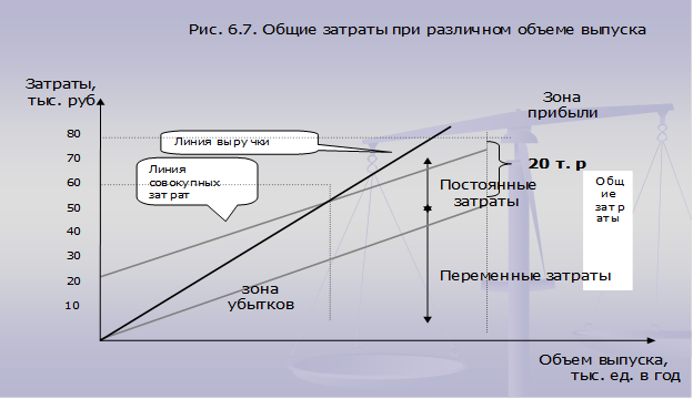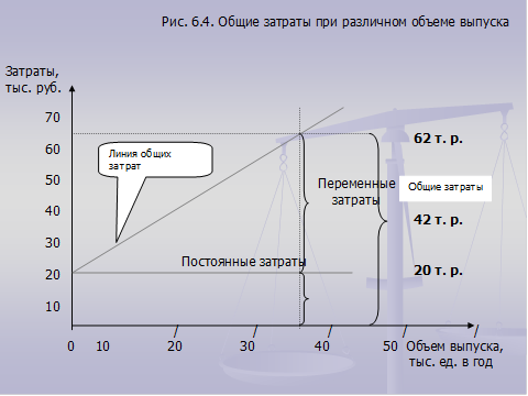 Рассмотрим условный пример. Предположим, что переменные затраты организации составляют 1,20 руб. на единицу продукции, а постоянные – 20 000,00 руб. в год. На рисунке 6.4 показано, как изменяются общие затраты при изменении объема выпуска. При объеме выпуска 35 000 ед. в год общие годовые затраты составляют 62 000,00 руб.: в том числе 20 000,00 руб. – постоянные затраты плюс 42 000,00 руб. – переменные (35 000 ед. х 1,20 руб.).
