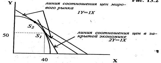 Пусть в закрытой экономике, при имеющихся ресурсах, год может быть произведено 50 единиц товара Y или 40 единиц товара X. Соотношение цен на внутреннем рынке устанавливалось на уровне 2Y=1X1 или 1Y=O,5X (точка S1 на рис. 13.2). Страна имеет сравнительные преимущества в производстве товара Y, поэтому после установления торговых отношений с другими странами ей будет выгодно экспортировать товар Y и обмен закупать более дешевый за границей товар X. Если мировая цена будет зафиксирована на уровне IX—1Y, то страна скорее всего изменит структуру своего производства и буди специализироваться на выпуске товара Y. Для этого а придется перевести ресурсы из отрасли X в отрасль Y. Но если раньше мы исходили из того, что издержки замещения постоянны, независимо от сочетания объемов выпускаемых товаров, а значит и при полной специализации на выпуске одного товара они остаются теми же, то теперь ресурсы уже не полностью взаимозаменяемы. Это означает, что при увеличении производства товара У соотношение издержек будет меняться, например, от 1Y=O,5X к 1Y=O,6X, 1Y=O,8X и т.д., что соответствует предположению о росте издержек замещения. Специализация на выпуске товара Y будет выгодной до тех пор, пока соотношение издержек в стране не сравняется с соотношением цен на мировом рынке, то есть не достигнет уровня 1Y=IX (точка S2 на рис. 13.2). Дальнейшее увеличение производства товара Y будет сопровождаться ростом предельных издержек и, следовательно, издержек замещения, которые превысят цены мирового рынка и сделают экспорт товара Y невыгодным.