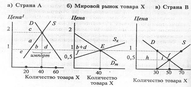 В стране А после снижения цен с 2Y до 1Y, то есть» до уровня мировых, область потребительского излишка (с) увеличится на площадь (a+b+d) и в целом составит (a+b+d+c) Производители товара X в стране А понесут убытки от снижения цен, соответствующие площади (а), поскольку в закрытой экономике прибыль производителей была равна области (а+е), а после установления торговых отношением падения цен и сокращения внутреннего производства с 40Х, 20Х составила только область (е). Таким образом, пот страны А получили выигрыш в размере области (a+b+d), a производители понесли потери, равные (а). В итоге выигрыш для страны в целом оказался равным: (a+b+d) - (a)=(b+d). Для простоты анализа мы принимаем предположение о равноценности единиц потерь производителей и выигрыша потребителей.