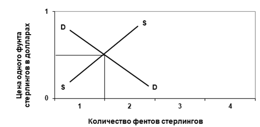 Точка пересечения спроса и предложения на фунты определяет цену фунтов в долларах. В этот момент равновесный валютный курс равняется 2 дол. за 1 фунт.