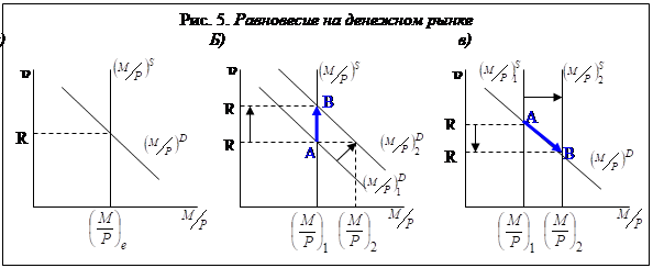 Рассмотрим последствия изменения равновесия на денежном рынке. Предположим, что величина предложения денег не меняется, но повышается спрос на деньги – кривая (М/Р)D1 сдвигается вправо-вверх до (М/Р)D2. В результате равновесная ставка процента повысится от R1 до R2 (рис.5.(б)). Экономический механизм установления равновесия на денежном рынке объясняется с помощью кейнсианской теории предпочтения ликвидности. Если в условиях неизменной величины предложения денег спрос на наличные деньги увеличивается, люди, имеющие, как правило, порфтель финансовых активов, т.е. определенное сочетание денежных и неденежных финансовых активов (например, облигаций), испытывая нехватку наличных денег, начинают продавать облигации. Предложение облигаций на рынке облиигаций увеличивается и превышает спрос, поэтому цена облигаций падает, а цена облигации, как уже было доказано, находится в обратной зависимости со ставкой процента, следовательно, ставка процента растет. Этот механизм можно записать в виде логической цепочки: (М/Р)D Ý Þ ВS Ý Þ РВ ß Þ RÝ. Рост спроса на деньги привел к росту равновесной ставки процента, при этом предложение денег не изменилось и величина спроса на деньги вернулась к исходному уровню, поскольку при более высокой ставке процента (более высоких альтернативных издержках хранения наличных денег), люди будут сокращать свои запасы наличных денег, покупая облигации.