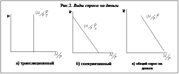 Виды спроса на деньги обусловлены двумя основными функциями денег: 1) функции средства обращения и 2) функции запаса ценности. Первая функция обусловливает первый вид спроса на деньги – трансакционный. Поскольку деньги являются средством обращения, т.е. выступают посредником в обмене, они необходимы людям для покупки товаров и услуг, для совершения сделок.