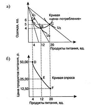 Первоначально цена продуктов питания составляла 25 р., цена одежды - 50 р., а доход равнялся 500 р. Максимизирующий полезность потребительский выбор находится в точке В (рисунок а). В этом случае потребитель покупает 12 единиц продуктов питания и 4 единицы одежды, что дает возможность обеспечить уровень полезности, определяемый кривой безразличия со значением полезности, равным U2.