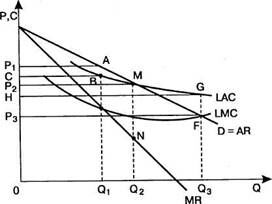 На графике LAC и LMC - кривые средних и предельных издержек в долгом периоде, D - кривая спроса, MR - соответствующая ей кривая предельного дохода. Оптимальные выпуск и цена Q1, P1 определяются пересечением кривых LMC и MR. Прибыль фирмы-монополиста равна площади СР1АВ. Однако выпуск Q1 "очень мал", а цена P1 "очень высока". Оптимальным для общества был бы выпуск О3 и цена Р3. Но на это монополист не пойдет. Отсюда наиболее целесообразным является то, чтобы государственный орган, регулирующий эту фирму-монополию, определил бы на ее продукцию цену Р3 = LMC (Q3). Этот уровень цен не возместил бы издержек на выпуск продукции, она была бы ниже средних издержек при объеме выпуска Q3, Р3 < LAC (Q3) = GO3 = ОН. В результате фирма-монополист, осуществляя оптимальный с позиции общества объем продукции Q3, имела бы убыток, равный площади P3HGF. В таком случае фирма-монополист может уйти с рынка. Чтобы предотвратить это, ей потребуется дотация, которая по крайней мере должна быть равной той же величине P3HGF, что, в свою очередь, может привести к чистым потерям общества.