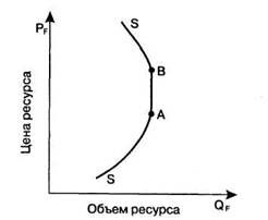 На отрезке кривой ниже точки А предложение прямо зависит от цен на ресурсы и с повышением цен на них имеет восходящий наклон. На отрезке от А до В кривая предложения совершенно неэластична, принимает вертикальный характер. Это ресурсы с фиксированным предложением (например, для земли). Выше точки В кривая предложения изгибается влево. Это случаи, когда увеличение цены ресурса приводит к значительному росту доходов владельцев (например, в случаях с рабочей силой).