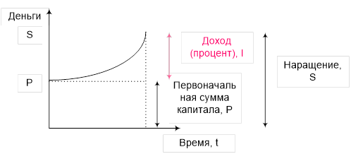 Начисление простых процентов применяется в практике в краткосрочных периодах. В долгосрочных финансовых операциях проценты не выплачиваются после их начисления, а присоединяются к основной сумме, т.е. происходит их капитализация. База для начисления процентов в каждом последующем периоде регулярно изменяется. В этом случае говорят об использовании сложных процентов.