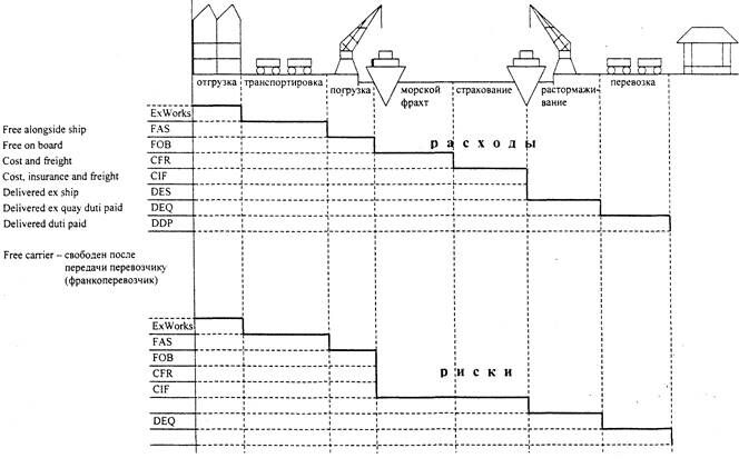 Существует 13 вариантов распределения обязанностей в ИНКОТЕРМС - международных правилах по толкованию торговых терминов. Этот документ содержит конкретизацию трактовки и толкование отдельных торговых терминов. Каждые 10 лет выходит новая редакция. Сейчас - ИНКОТЕРМС-2000.