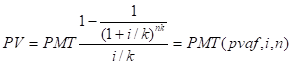 Где (1-1/(1+i/k)^nk)/(i/k) – фактор текущей стоимости обычного аннуитета при более частых, чем 1 раз в год платежах (поступлениях)