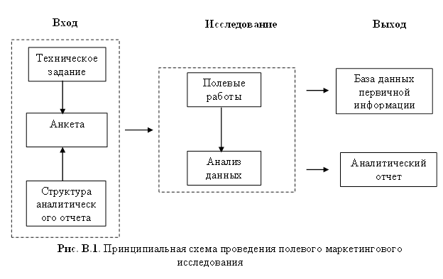 При этом, как следует из рис. В.1, основным результатом первого этапа («Вход») является анкета для опроса целевой аудитории на втором этапе («Исследование»). Второй этап имеет сразу два результата («Выход»). С одной стороны, в результате полевых работ происходит формирование базы данных первичной информации (на основании заполненных анкет), которые затем вводятся в компьютер и анализируются при помощи статистических и когнитивных методов. С другой стороны, в результате анализа данных происходит написание аналитического отчета по исследованию. Оба данных элемента — база данных и аналитический отчет — передаются заказчику (предоставляются руководству компании).
