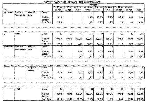 посещения развлекательного центра каждой из анализируемых целевых групп опрошенных. Например, первая ячейка показывает, что 5 (строка Count) респондентов-мужчин в возрасте от 18 до 25 лет посещают развлекательный центр каждый день. Это составляет 8,1% (подстрока % within Возраст) от общего количества мужчин в возрасте от 18 до 25 лет, ответивших на три предложенных вопроса, или 1,5% (подстрока % of Total) от общего числа мужчин, ответивших на вопросы (это число 333, оно представлено на пересечении строки и столбца Total в первой части таблицы Мужчины).
