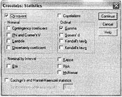 Если в перекрестном анализе участвуют номинальные переменные, силу (но не направление) связи позволяет определить критерий Cramer's V. Отображение этого критерия можно установить в диалоговом окне Statistics при помощи параметра Phi and Cramer's V (см. рис. 4.5).