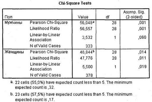 В первой таблице, Chi-Square Tests, выводятся результаты расчета критерия