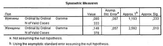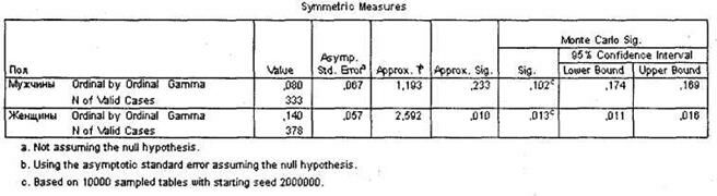 Для порядковых переменных (как в нашем случае) определить силу связи позволяет критерий Gamma. Этот показатель может варьироваться в интервале от -1 (максимально разнонаправленная зависимость) до 1 (полная зависимость); значение О показывает полное отсутствие зависимости. Значение критерия Gamma представлено в столбце Value таблицы Symmetric Measures. В нашем случае в группе респондентов-мужчин имеется лишь весьма слабая положительная зависимость (Gamma = 0,080). Столбец Approx. Sig. свидетельствует о том, что данная зависимость еще и статистически незначима. Обратная ситуация в группе респондентов-женщин: для них установлена слабая, но статистически значимая положительная зависимость между возрастом и частотой посещения развлекательного центра.