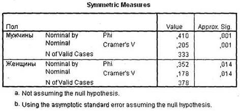 После того как мы установили наличие зависимости между тремя анализируемыми переменными (при этом между возрастом и частотой посещения для респондентов-женщин существует и линейная зависимость), можно приступить к анализу таблицы Symmetric Measures (рис. 4.7), чтобы определить силу выявленной связи.