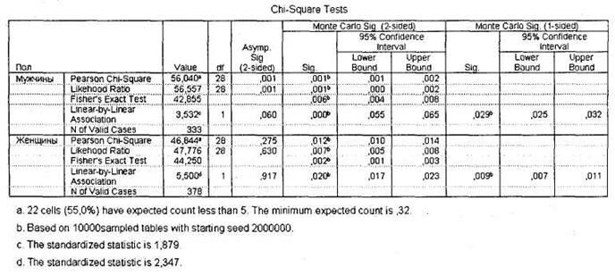 действительно свидетельствует о наличии статистически значимой зависимости между полом, возрастом и частотой посещения развлекательного центра — это следует из весьма высокой значимости теста Monte-Carlo (0,001 — для мужчин и 0,012 — для женщин). В 95 % случаев данное значение не выходит за рамки статистической значимости (например, для мужчин оно варьируется в пределах от 0,001 до 0,002). Также из таблицы мы видим, что выявленная связь является линейной только для целевой группы респондентов-женщин. Таким образом, для нашего случая все предварительные выводы, сделанные нами в таблице Chi-Square Tests, подтвердились результатами теста Monte-Carlo.
