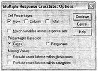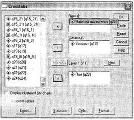 В диалоговом окне Crosstabs в область каждого измерения (Rows, Columns, Layer) можно поместить сразу несколько переменных. Максимальное число переменных, которые можно поместить в области Rows и Columns, — 76; для каждого из восьми возможных уровней Layer — 6. Если задано по одной переменной в строке и столбце (как в нашем случае), все дополнительно указанные слои будут отображаться в одной и той же таблице. Ситуация будет отличаться, если мы укажем несколько переменных для строк, столбцов и слоев в одних и тех же областях (не щелкая на кнопке Next для задания нескольких слоев) перекрестной таблицы. В этом случае будут построены отдельные таблицы для каждой пары строковых и столбцовых переменных.