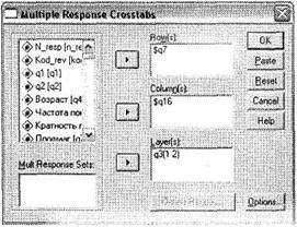 Обратите внимание, что всегда, когда обратное не обусловлено задачами исследования, рекомендуется размещать переменные с малым количеством вариантов ответа в слоях. Это позволит уменьшить размерность результирующей таблицы. Мы можем задать и большее количество измерений таблицы, щелкая на кнопке Next в области Layer и добавляя релевантные переменные. Максимальное количество слоев, которое можно задать, щелкая на кнопке Next, — 8. Следовательно, максимально возможное количество измерений перекрестной таблицы по одновариантным вопросам — 10(10 = 8 слоев + 1 строковая переменная + 1 столбцовая переменная).