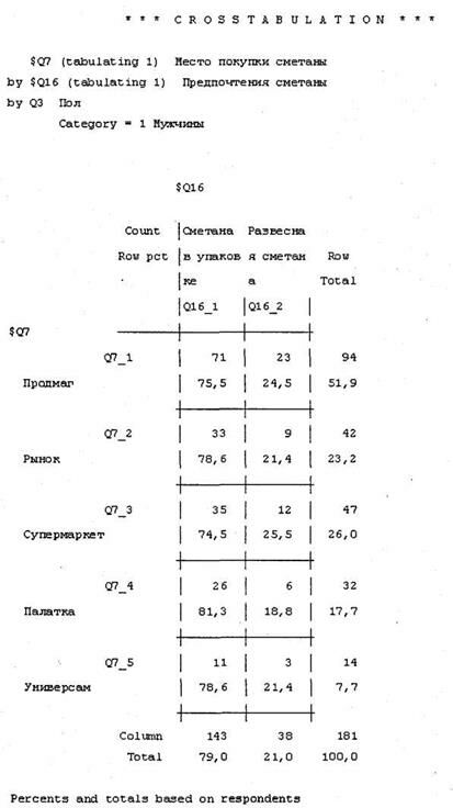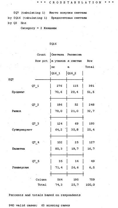 Перекрестные распределения служат для выявления различных типов зависимостей между двумя и более переменными. Например, если требуется установить, где покупают сгущенное молоко мужчины и женщины, следует воспользоваться таблицами перекрестных распределений (таблицами сопряженности, или кросста-буляции). На основании перекрестных распределений можно установить не только наличие зависимости (немонотонной или монотонной) между переменными, но, в большинстве случаев, ее тип (линейная или нелинейная) и направление (возрастающая или убывающая)1. Установленная при помощи перекрестного распределения зависимость может оказаться незначимой из-за малого размера выборки или по другим причинам. Статистическую значимость выявленной зависимости позволяет определить критерий