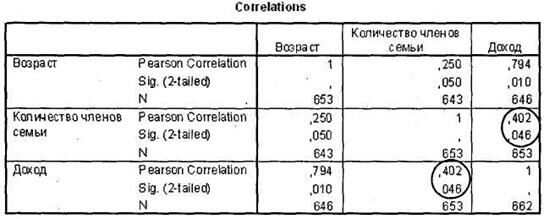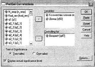 Как видно из таблицы, обе рассматриваемые переменные коррелируют с третьей переменной Возраст. В такой ситуации корреляция между уровнем дохода респондентов и численностью их семей может объясняться влиянием третьей переменной: возраста респондентов. То есть связанными (коррелирующими), на самом деле, являются пары возраст/уровень дохода и возраст/количество членов семьи. Проверим данную гипотезу при помощи частных коэффициентов корреляции.
