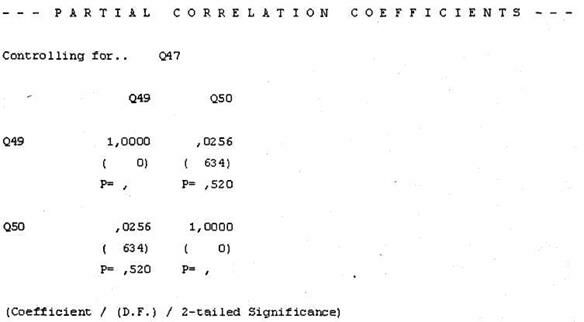 В окне SPSS Viewer появятся результаты расчетов частных коэффициентов корреляции (рис. 4.25). В данной таблице первая строка каждой ячейки содержит коэффициент корреляции Пирсона, а третья — статистическую значимость данного коэффициента. Из таблицы вы видите, что между количеством членов семьи (q49) и уровнем дохода (q50) больше не наблюдается статистически значимой корреляции (Р = 0,520), а коэффициент Пирсона сильно уменьшился (0,0256). Следовательно, корреляция, представленная на рис. 4.23, объясняется влиянием третьей переменной Возраст и, таким образом, является ложной.