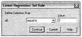 Так как задача анализа содержит требование провести регрессионный анализ в разрезе трех классов полета, выберите в левом списке переменную, обозначающую класс (q5) и перенесите ее в область Selection Variable. Затем щелкните на кнопке Rule, чтобы задать конкретное значение данной переменной для регрессионного анализа. Следует отметить, что за одну итерацию можно построить регрессию только в разрезе какого-то одного класса полета. В дальнейшем следует повторить все этапы сначала по количеству классов (3), каждый раз выбирая следующий класс.