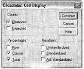Теперь, когда вы указали все переменные для анализа, для построения перекрестных распределений можно щелкнуть на кнопке ОК. Однако сначала давайте рассмотрим некоторые другие полезные функции диалогового окна Crosstabs. Щелкните на кнопке Cells. Отрывшееся диалоговое окно Cell Display (рис. 4.2) предназначено для задания значений, выводимых в кросстабуляционной таблице. По умолчанию SPSS в каждой ячейке таблицы выводит только количество респондентов (параметр Observed). Область Percentages позволяет организовать вывод в ячейках таблицы процентов по строкам (Rows), столбцам (Columns), а также от общего числа респондентов, ответивших одновременно на все вопросы, по которым строится перекрестное распределение (Частота посещения, Возраст и Пол) (Total).