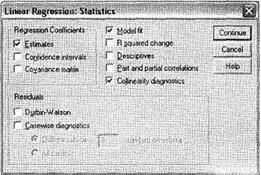 Щелкните на кнопке Continue в диалоговом окне Set Rule — вы вновь вернетесь к основному диалоговому окну Linear Regression. Последним шагом перед запуском процедуры построения регрессионной модели является выбор пункта Collinearity Diagnostics в диалоговом окне, появляющемся при щелчке на кнопке Statistics (рис. 4.27). Установление требования провести диагностику наличия коллинеарности между независимыми переменными позволяет избежать эффекта мульти-коллинеарности, при котором несколько независимых переменных могут иметь настолько сильную корреляцию, что в регрессионной модели обозначают, в принципе, одно и то же (это неприемлемо).