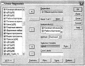 В более сложных случаях, когда требуется построить регрессионную модель в разрезе трех и более переменных, следует воспользоваться условным отбором данных (см. раздел 1.5.1). Например, если кроме класса полета есть еще и необходимость раздельного построения регрессионной модели для респондентов (мужчин и женщин), необходимо перед открытием диалогового окна Linear Regression произвести условный отбор анкет респондентов, являющихся мужчинами. Далее проводится регрессионный анализ по описываемой схеме. Для построения регрессии для женщин следует повторить все этапы сначала: вначале выбрать только анкеты респондентов-женщин и затем уже для них построить регрессионную модель.