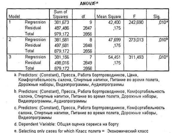 - коэффициентом параметра работы бортпроводников стоял знак -, его следовало бы интерпретировать следующим образом: чем хуже работают бортпроводники, тем лучше становится общее впечатление пассажиров от полета. Такая интерпретация является бессмысленной и не отражающей реального положения вещей, то есть ложной. В таком случае лучше пересчитать регрессию без данного параметра; тогда доля вариации в итоговой оценке, описываемой исключенным параметром, будет отнесена на счет константы (увеличивая ее). Соответственно уменьшится и процент совокупной дисперсии, описываемой регрессионной моделью (величина R2). Однако это позволит восстановить семантическую релевантность.