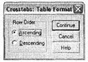 Следующее диалоговое окно, которое мы рассмотрим, — это Table Format, вызываемое при помощи кнопки Format (рис. 4.3). В нем можно выбрать тип сортировки вариантов ответа строковой переменной: возрастающая или убывающая (по алфавиту). Оставьте выбранный по умолчанию вариант Ascending (возрастающая) и щелкните на кнопке Continue, чтобы закрыть окно. После этого запустите процедуру построения перекрестных распределений, щелкнув на кнопке О К в главном диалоговом окне Crosstabs. В главном диалоговом окне процедуры есть и другие полезные (Ьункпии: мы оассмотоим их ниже.