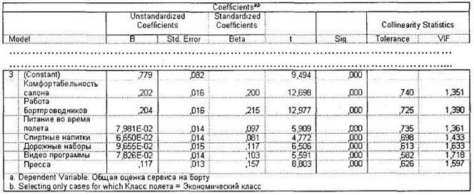 В первом столбце таблицы Coefficients содержатся независимые переменные, составляющие регрессионное уравнение (удовлетворяющие требованию статистической значимости). В нашем случае в регрессионную модель входят все частные характеристики сервиса на борту самолета, кроме аудиопрограмм. Исключенные переменные содержатся в таблице Excluded Variables (здесь не приводится). Итак, мы можем сделать первый вывод о том, что на общее впечатление авиапассажиров от полета оказывают влияние семь параметров: комфортабельность салона, работа бортпроводников, питание во время полета, спиртные напитки, дорожные наборы, видеопрограммы и пресса.