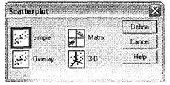 Диалоговое окно Linear Regression имеет встроенное средство для построения графиков — кнопку Plots. Однако это средство, к сожалению, не позволяет на одном графике построить две переменные: S, и So- Для того чтобы построить тренд, необходимо использовать меню Graphs ► Scatter. На экране появится диалоговое окно Scatterplot (рис. 4.32), которое служит для выбора типа диаграммы. Выберите вид Simple. Максимально возможное число независимых переменных, которое можно изобразить графически, — 2. Поэтому при необходимости графического построения зависимости одной переменной (зависимой) от двух независимых (например, если бы в нашем распоряжении были данные не по двум, а по трем годам), в окне Scatterplot следует выбрать 3-D. Схема построения трехмерной диаграммы рассеяния не имеет существенных отличий от описываемого способа построения двухмерной диаграммы.