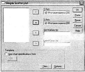 После щелчка на кнопке Define на экране появится новое диалоговое окно, представленное на рис. 4.34. Поместите в поле Y Axis зависимую переменную (Итоговая оценка 2001), а в поле X Axis — независимую (Итоговая оценка 2000). Щелкните на кнопке 0 К, что приведет к построению диаграммы рассеяния.