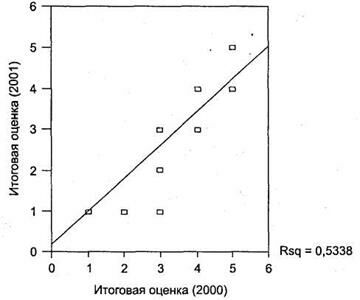 Эту операцию следует начать с построения регрессионного уравнения. Для этого повторите все вышеописанные шаги для двух переменных: зависимой Итоговая оценка 2001 и независимой Итоговая оценка 2000. Вы получите коэффициенты, при помощи которых можно в дальнейшем строить линию тренда (как в SPSS, так и любыми другими средствами). В нашем случае полученное регрессионное уравнение имеет вид: S{ = 0,18 + 0,81 х So. Теперь построим уравнение линии тренда в SPSS.