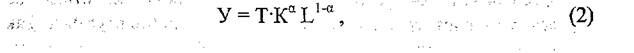 где а и 1-а - коэффициенты эластичности объема выпуска (дохода Y) по фактору производства, т.е. по капиталу (К) и труду (L).