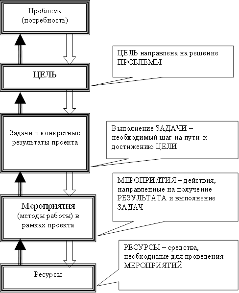 Нисходящие стрелки здесь показывают логическую последовательность формулирования частей проекта, восходящие – последовательность его осуществления.