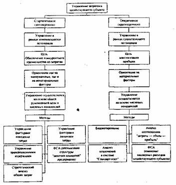 Управление затратами хозяйствующего субъекта как целостная система состоит из двух важных составляющих: стратегического и оперативного уровня управления затратами. Каждый из этих уровней имеет свои цели, принципы и методы, показанные на рис. 1.2.