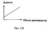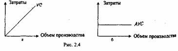 Переменные затраты. Рис. 2.4 иллюстрирует поведение переменных затрат на общий объем производства (рис. 2.4а) и единицу продукции (рис. 2.46).