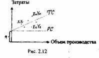 Далее на графике "затраты - объем" отображаются точки X1Y1, X2Y2...XnYn. Имея несколько таких точек, можно приблизительно начертить прямую, которая отвечает зависимости между затратами и объемом производства. Точка пересечения этой линии с осью ординат определяет величину постоянных затрат (рис. 2.12 ).