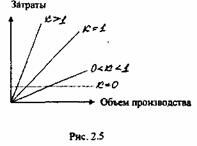 4. К > 1. Прогрессивные затраты. В этом случае каждая дополнительно произведенная единица продукции к более чем пропорциональному увеличению издержек. Например, при работе цеха на пределе возможностей, и в процессе производства лишних единиц продукции может возникнуть необходимость по-новому складировать уже готовые изделия, что приведет к более высоким затратам.