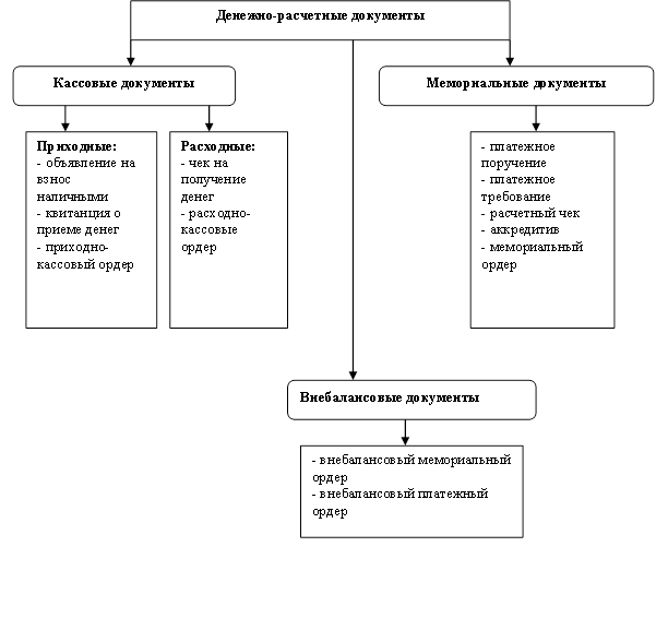 Наиболее распространенный вид банковских документов – денежно-расчетные документы. Денежно-расчетные документы поступают в банки от предприятий и учреждений, других банков, а также составляются в банке и содержат необходимую информацию о характере операций, позволяющую проверить их законность и осуществить банковский контроль. Все денежно-расчетные документы по характеру отражаемых операций подразделяются на кассовые, мемориальные и внебалансовые.