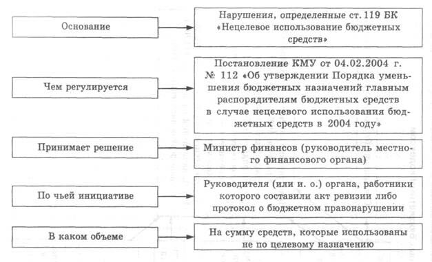 Нецелевое использование бюджетных средств имеет последствия для их распорядителей: привлечение ответственных должностных лиц к дисциплинарной, административной или уголовной ответственности. Кроме того, нецелевое использование бюджетных средств влечет за собой уменьшение ассигнований распорядителям бюджетных средств на сумму средств, использованных не по целевому назначению (ст. 119 Бюджетного кодекса). На сегодняшний день механизм уменьшения ассигнований установлен Порядком уменьшения бюджетных назначений главным распорядителям бюджетных средств в случае нецелевого использования бюджетных средств в 2004 году, утвержденным постановлением КМУ от 04.02.2004 г. № 112.