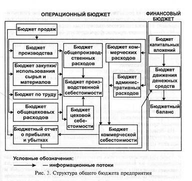 Общий бюджет (основной бюджет) - это скоординированный по всем подразделениям и функциям план работы предприятия в целом, объединяющий блоки отдельных бюджетов и характеризующий информационный поток для принятия и контроля управленческих решений в области финансового планирования. Структура общего бюджета представлена на рис. 3.